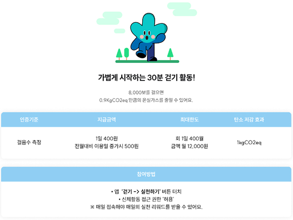 걷기 8,000보 달성 시, 1일 400원 적립받을 수 있습니다.