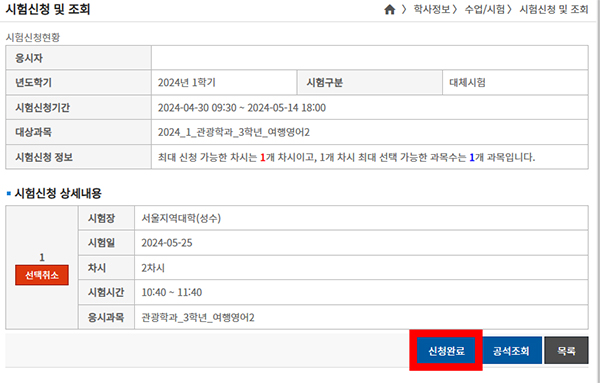 상세내용을 다시 확인 후 신청완료를 누릅니다.