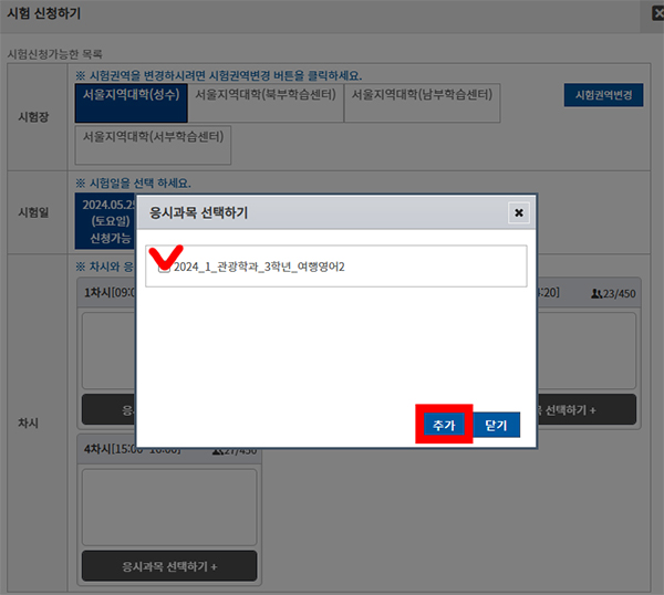 응시할 과목을 체크 선택해서 추가버튼을 누릅니다.