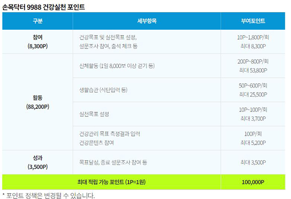 | 활동 (88,200P) | 신체활동 (1일 8,000보 이상 걷기 등) | 200P~800P/회 최대 53,800P |