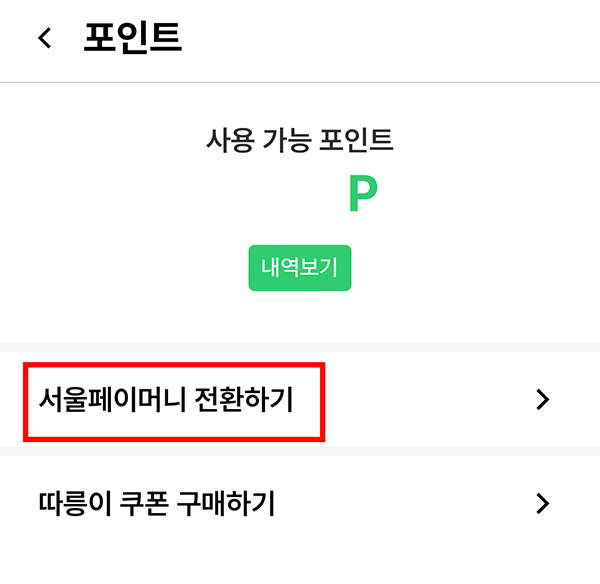어플 상단에 적립된 포인트가 나와있는 부분을 눌러서보면 포인트 내역을 보거나 서울페이로 전환이 가능합니다.