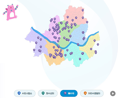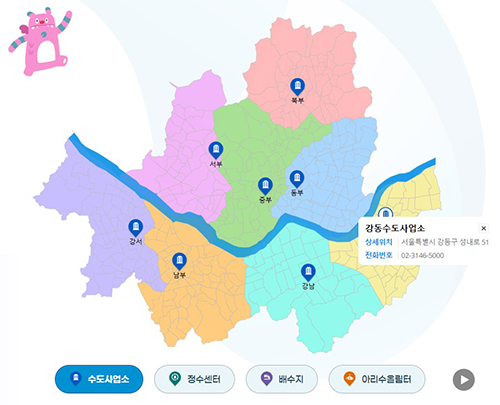 홈페이지 접촉하시면 수도사업소, 정수센터, 배수지, 아리수올림터 위치를 보실 수 있습니다.