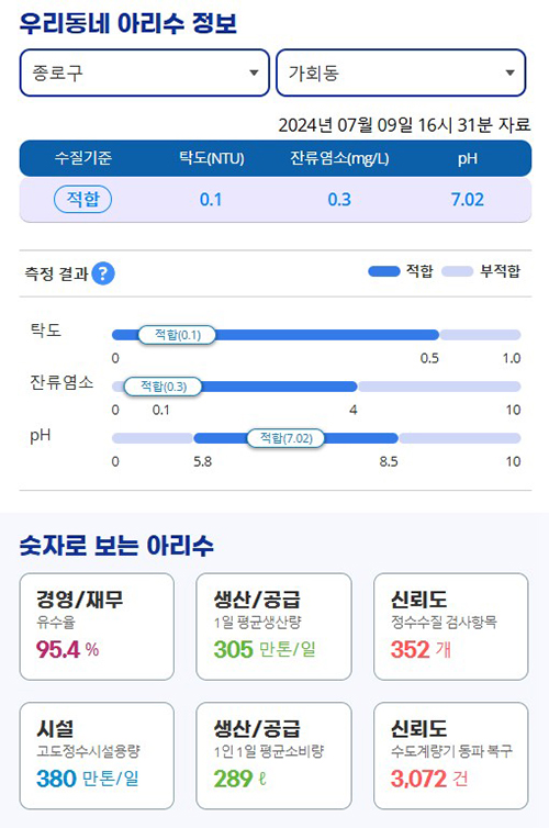 또한 우리 동네 아리수 정보로 지역을 선택하면 수질기준에 적합여부와 탁도, 잔류염소, PH 측정 결과를 보실 수 있습니다.