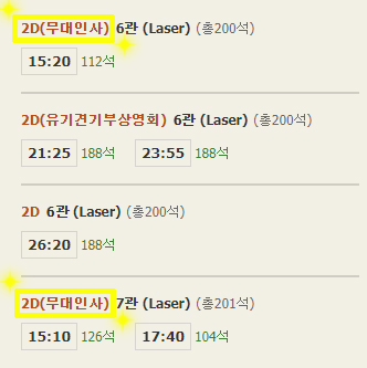 | 영화관 | 상영관 | 무대인사시간 | 무대인사 | 상영시간 |