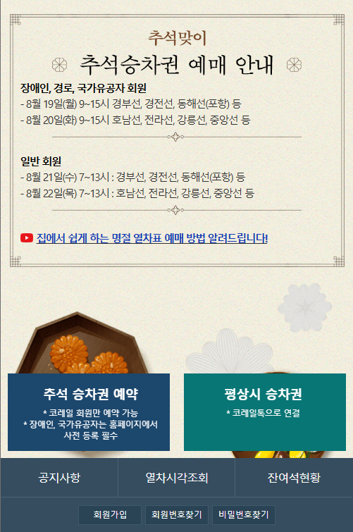 ✔ 추석 승차권 예매는 PC, 모바일, 전화예매(일부)로 시행하며, 역, 판매대리점, TMO에서 구입하실 수 없습니다.