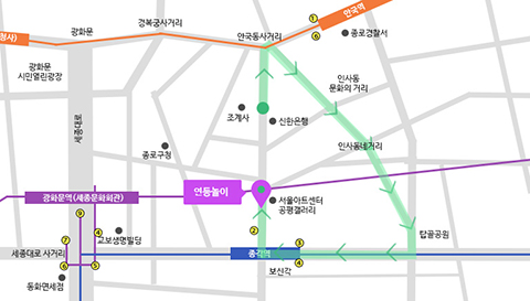 - 흥인지문 : 지하철 1,4호선 동대문역 9,10번 출구 앞 연등행렬 시작