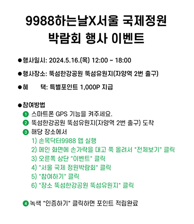 * 5/18(토), 5/19(일)은 서울국제정원박람회 본행사 기간 중 주말이라 뚝섬한강공원 내 주차장이 매우 혼잡하오니 대중교통을 이용해 주시기 바랍니다.