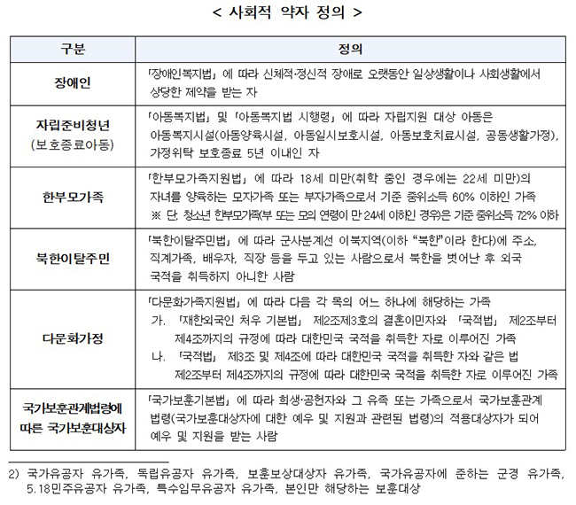 ✔ 사회적 약자 : 장애인, 자립준비청년(보호종료아동), 한부모 가족, 북한이탈주민, 다문화가정, 국가보훈대상자