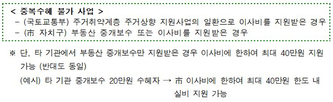 ✔ 2022년 1월 1일 이후 서울시로 전입하거나 서울시 내에서 이사 후 타 기관에서 부동산 중개보수 및 이사비 지원받은 자