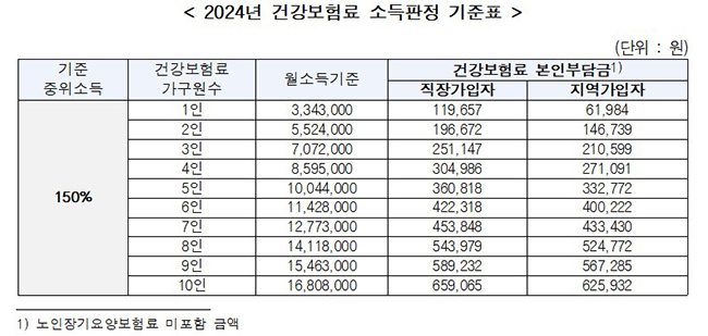 - 신청인이 속한 가구의 건강보험료 고지금액(2024년 7월분)이 2024년 건강보험료 소득판정기준표상 기준 중위소득 150%의 건강보험료 본인부담금 이하이어야 합니다.